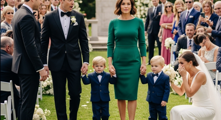 Lila entered quietly, wearing a navy-blue dress that modestly complimented her figure. Her hair was pulled back, and on each side of her stood a child—one boy, one girl, both around six years old. Their expressions mirrored each other: curious, calm, and wide-eyed as the