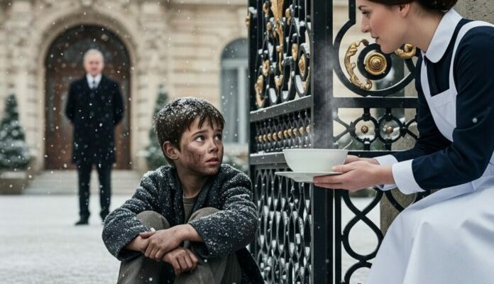 It was one of those gray afternoons when the sky looked heavy enough to fall. Claire Bennett, maid of the sprawling Harrington estate in Boston, was sweeping the marble steps when she noticed a small figure standing by the wrought-iron gate.