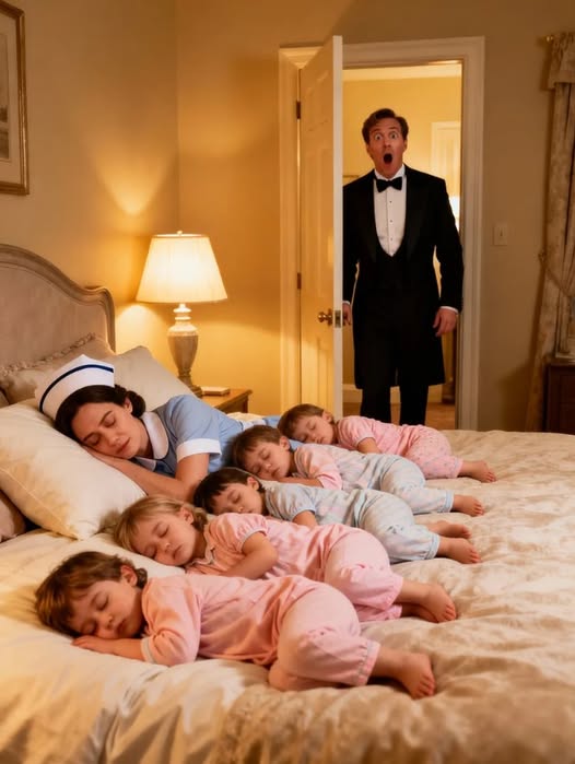 Six girls stood watching from the stairs. Hazel, twelve, her posture rigid. Brooke, ten, pulling at her sleeves. Ivy, nine, eyes darting. June, eight, pale and quiet. The twins Cora and Mae, six, smiling with too much intention. And Lena, three, clutching a torn stuffed rabbit.