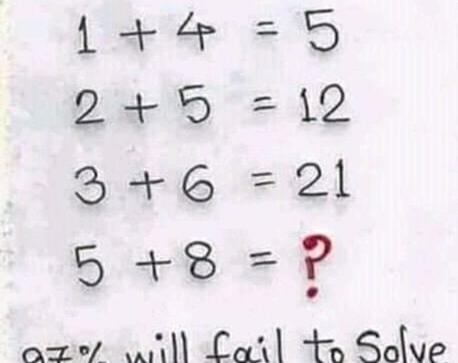 1 + 4 = 5 2 + 5 = 12 3 + 6 = 21 5 + 8 = ?