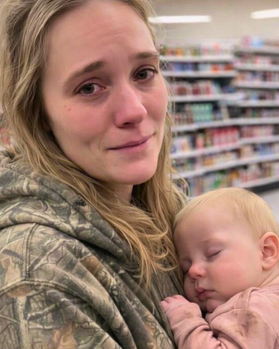 She looked to be in her early thirties. Her hair was pulled into a messy bun, her hoodie worn soft from too many washes, cheap leggings, old sneakers. A baby was strapped to her chest, his tiny face pressed against her shoulder.
