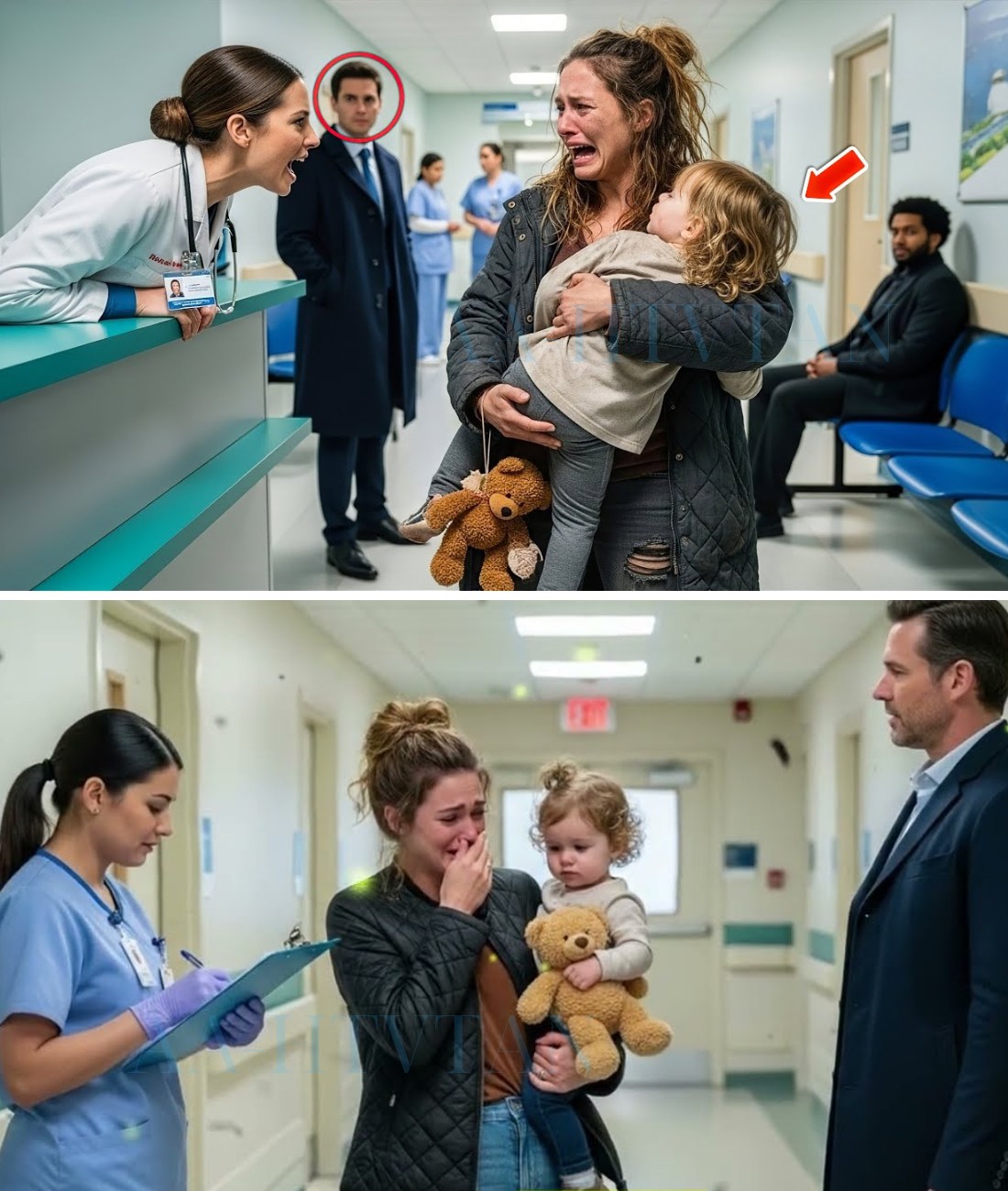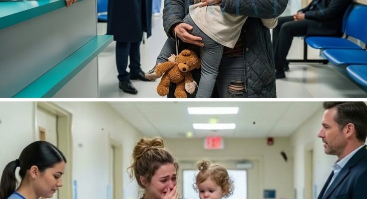 The voice cracked, raw and desperate. Heads turned. A woman knelt by the reception desk, clutching a small girl against her chest. Her jacket was threadbare, the seams of her shirt frayed, and in her trembling hand hung a teddy bear missing one button eye. The child in her arms was limp, her skin pale, her breaths shallow and weak.
