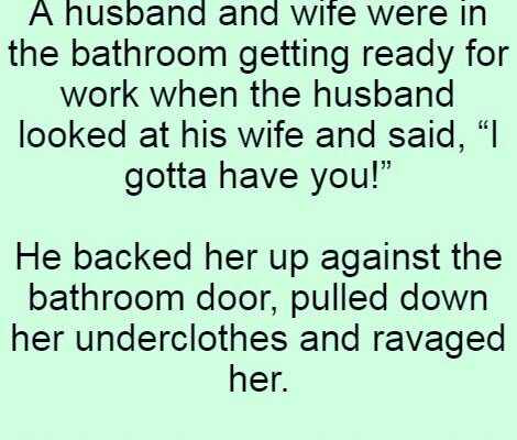 A husband and wife were in the bathroom getting ready for work when the husband looked at his wife and said, “I gotta have you!” He backed her up against the bathroom door, pulled down her underclothes and ravaged her. He knew he was doing great because she screamed and wiggled more than she ever had before.