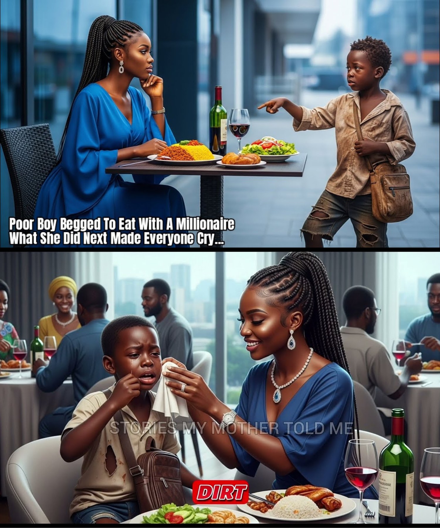 But Evelyn looked at Liam with gentle eyes and smiled warmly. “Of course you can. Please, have a seat,” she said, pulling out a chair for him. She ordered a hearty meal for Liam, and as they ate together, she listened to his story—how he had lost his parents and had been living on the streets, dreaming of a better life.