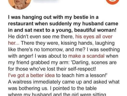 It was a typical evening at a restaurant with my best friend when a painful surprise unfolded. I saw my husband with a young, beautiful woman, laughing and sharing intimate moments, completely unaware of my presence. Anger surged inside me, but my wise friend intervened.