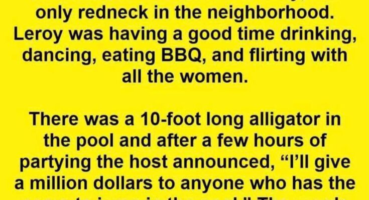 After a few hours of partying, the host said, “I’ll give a million dollars to anyone who has the nerve to jump into the pool.” The words had only left his mouth when there was a massive splash. Everyone turned around and discovered Leroy in the pool! The water was swirling and splashing as Leroy fought the gator. Leroy poked it in the eye, punched it, and tried to strangle it. He ultimately succeeded, leaving it floating in the water as he carefully climbed out.