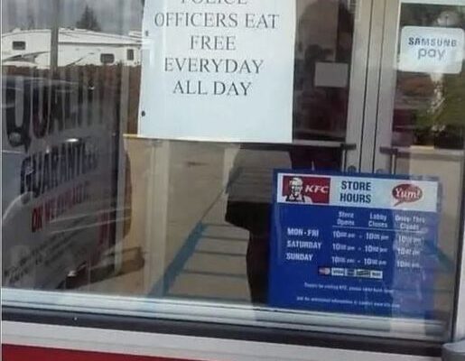 Since the sign was placed on the window of KFC, it has caused quite a stir online, garnering an impressive number of likes and shares on Facebook. Customers aren’t the only ones who have noticed; store employees have also joined in on the conversation, expressing their agreement that all uniformed police officers should be served free daily.