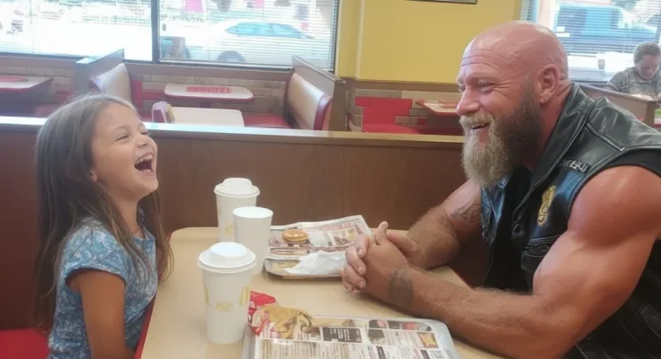Tall, broad-shouldered, his arms covered in tattoos, his face marked with scars, and his leather vest patched with symbols most people didn’t recognize. Parents in the McDonald’s dining room whispered when he walked in. The manager frowned whenever he ordered food. Even other customers kept their distance, certain he was dangerous.