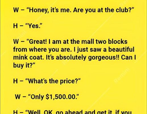 W: “Excellent! Two blocks away from you is the mall where I am now. I just noticed this stunning mink coat. It’s really very beautiful! Is it available for purchase?