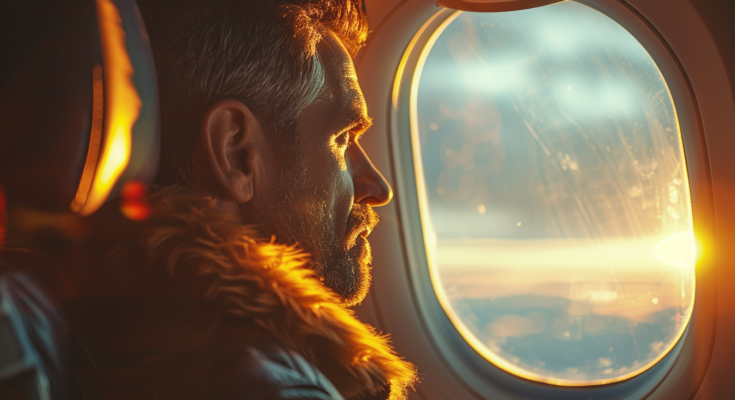 A smiling man sitting by the window in an airplane | Source: Midjourney