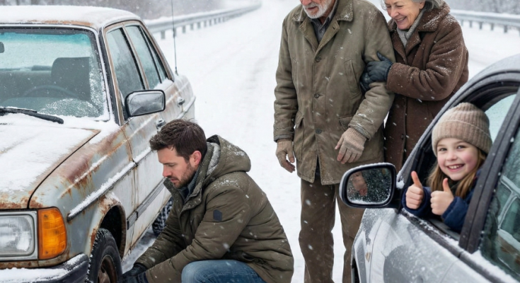 It was an old sedan, maybe fifteen or twenty years past its prime, with rust spots blooming along the wheel wells and a rear bumper held on with what looked like duct tape and prayer. The front passenger tire was completely shredded, rubber peeling away from the rim like a banana skin. Standing beside it were an elderly couple, and even from a distance, I could see they were in trouble.