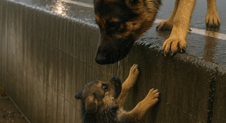 It was one of those relentless afternoons when the rain fell like silver sheets across the windshield. The road was nearly empty, and I was focused only on reaching home when something unusual caught my eye. On the shoulder of the road stood a German Shepherd—drenched, shivering, her ribs faintly visible through her soaked fur.