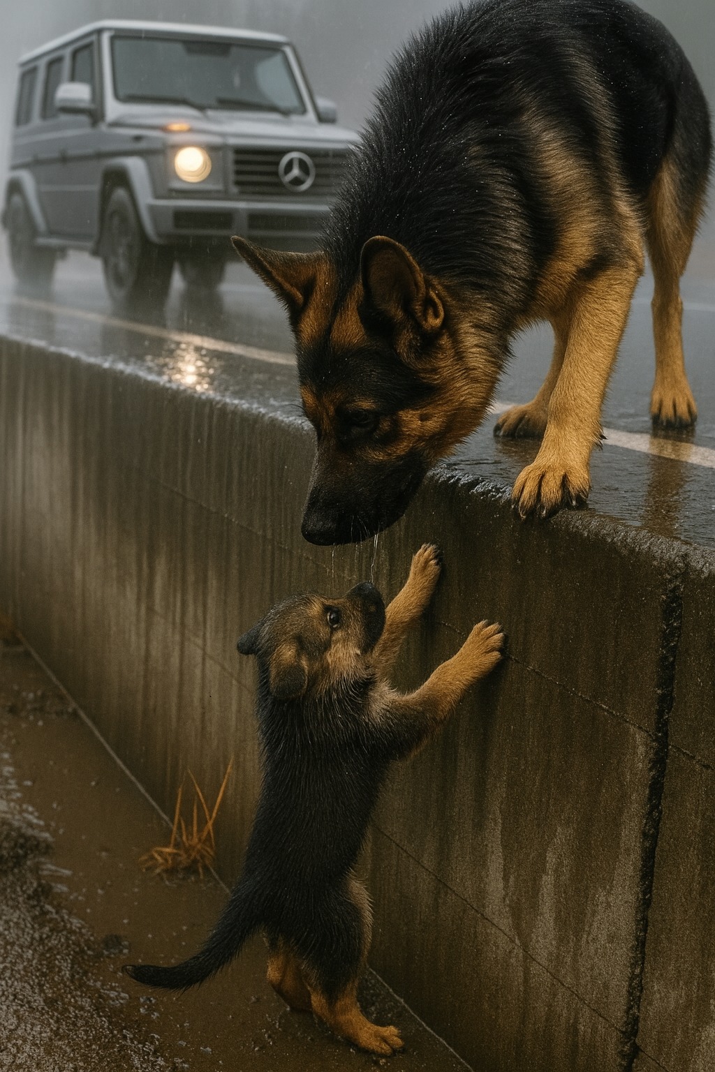 Carefully, I crouched down, reached over the slick edge, and scooped the little one into my arms. The pup trembled violently, its fur cold and heavy with rain. Slowly, I carried it up to the road, placing it gently beside its mother.