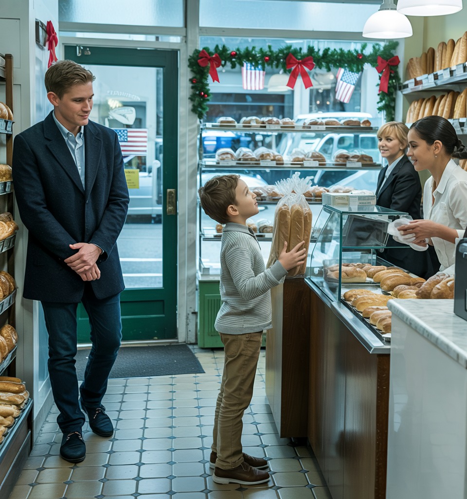 The bell chimed softly as Thomas pushed open the door. Warmth and the heavenly scent of fresh bread enveloped them immediately. The bakery was beautifully decorated for the holidays—strings of lights along the crown molding, a small tree in the corner adorned with ornaments shaped like croissants, wreaths on the walls. Behind the counter stood a woman arranging pastries, perhaps thirty years old, with dark hair pulled back in a neat ponytail and wearing a simple green apron over a cream sweater. Her face had a quiet beauty, though Thomas noticed the tiredness around her eyes, the slight slump of her shoulders that spoke of burdens carried too long.