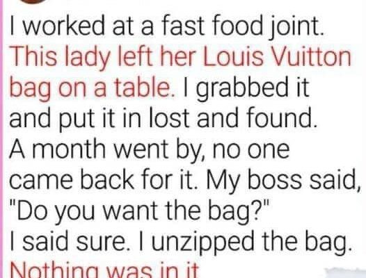 One day while working at a fast food restaurant, a lady left her Louis Vuitton bag on a table. “I waited about 20 minutes,” the narrator recalled, “but she had already left.” Acting promptly, I placed it in the lost and found without peeking inside.