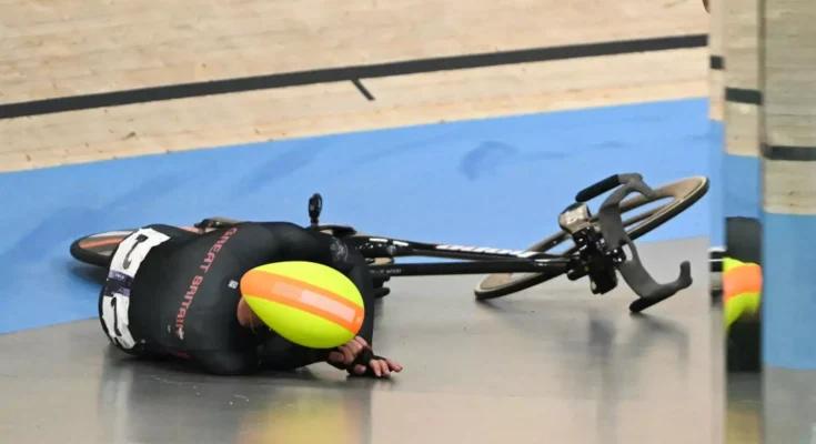 The crash left Team GB’s Oliver Wood sprawled out across the track. (SEBASTIEN BOZON/AFP via Getty Images)