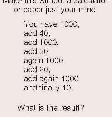 Starting with 1000, add 40, then 1000, followed by 30, another 1000, then 20, another 1000, and finally add 10.