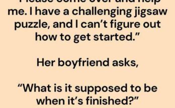 “Please come over and help me. I have a challenging jigsaw puzzle, and I can’t figure out how to get started.” Her boyfriend asks, “What is it supposed to be …
