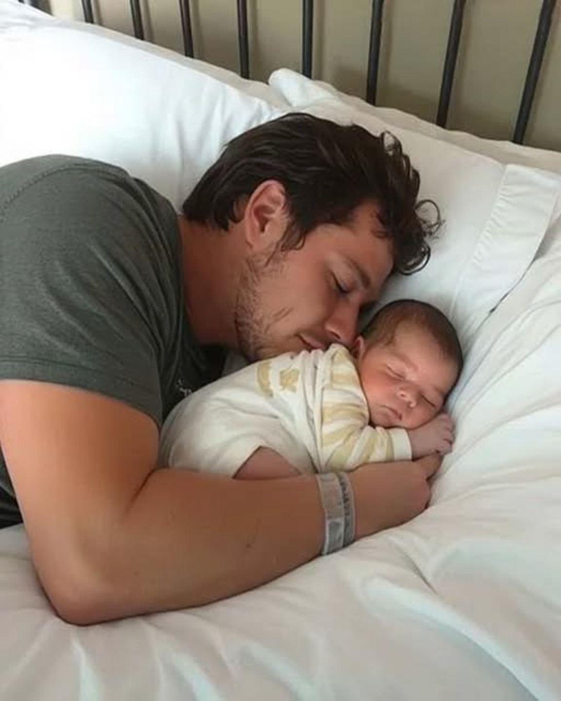 A tiny infant, wrapped snugly in a soft blue blanket, lay peacefully beside him. A pillow was placed carefully near the edge, as if someone had been afraid the baby might roll off.