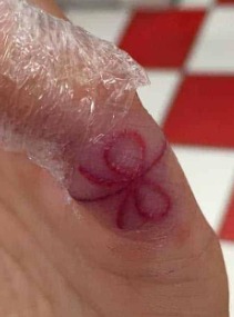 To learn more about the red string tattoo in question, I used the internet. In Asian countries, it is called the “red string of fate.” The tattoo looks like a simple bow with tails, like a shoelace that is tied. It usually shows up on a man’s thumb and a woman’s pinky finger.