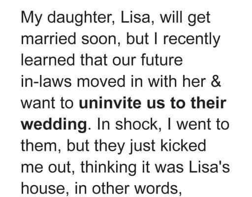 Ellen was shocked. She couldn’t possibly understand why her future son-in-law’s parents would want to exclude them from their own daughter’s wedding and how could Lisa even agree on such a thing.