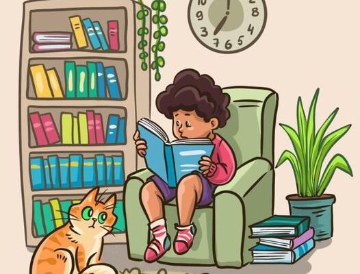 The image features a young boy engrossed in a book, with his vigilant cat by his side.