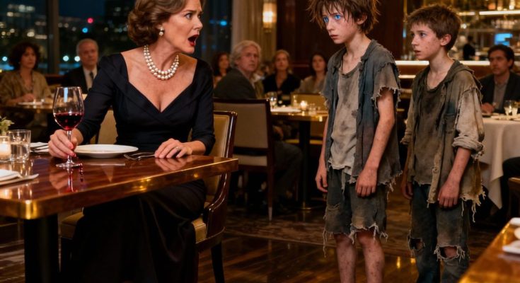 When two homeless boys timidly approached a luxurious restaurant asking for leftovers, the last thing anyone expected was for the wealthy woman inside to freeze in shock. Her diamond bracelet slipped from her wrist—because standing before her was the son she thought she had lost forever.